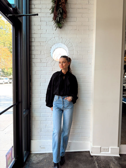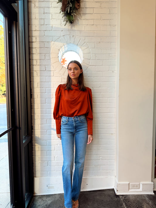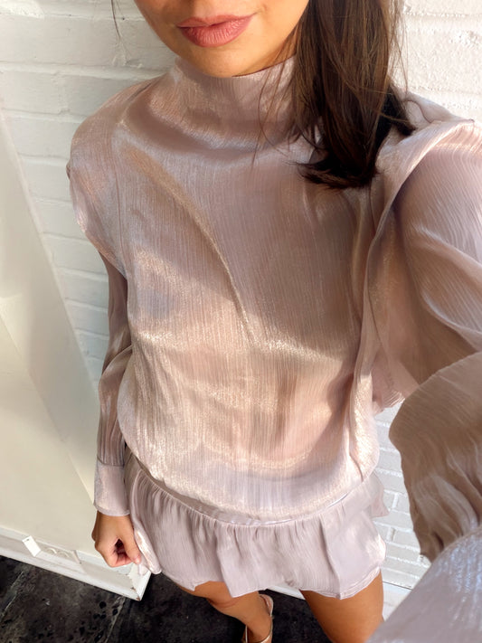 LONG SLEEVE MOCK NECK OPEN BACK BLOUSE
