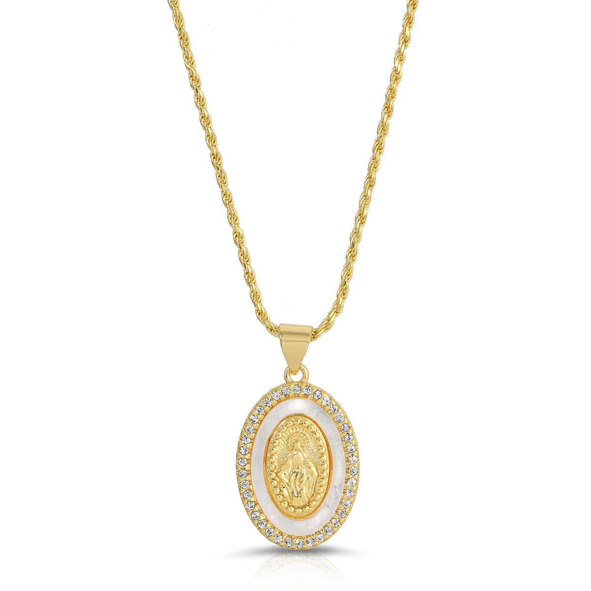 Featuring a mother of pearl inlay with Mary silhouette in center, this pendant is perfect to pair with the classic mother Mary necklace.