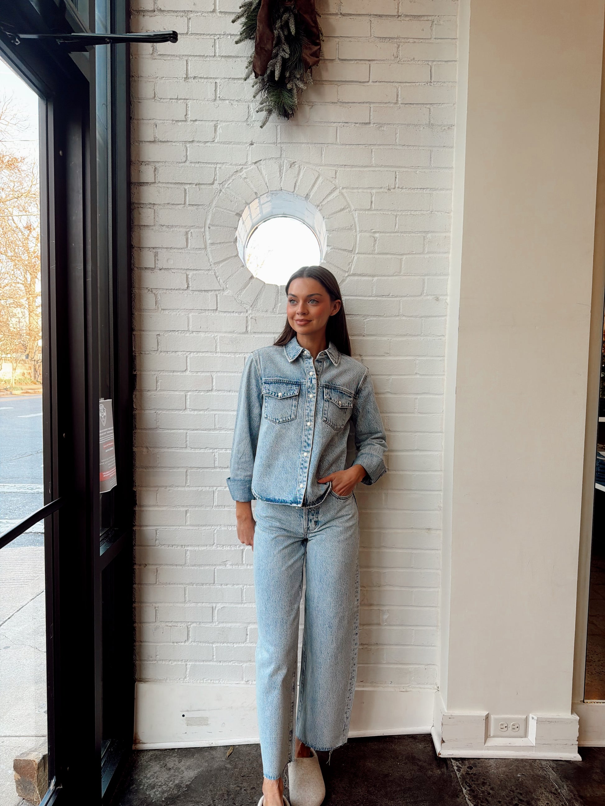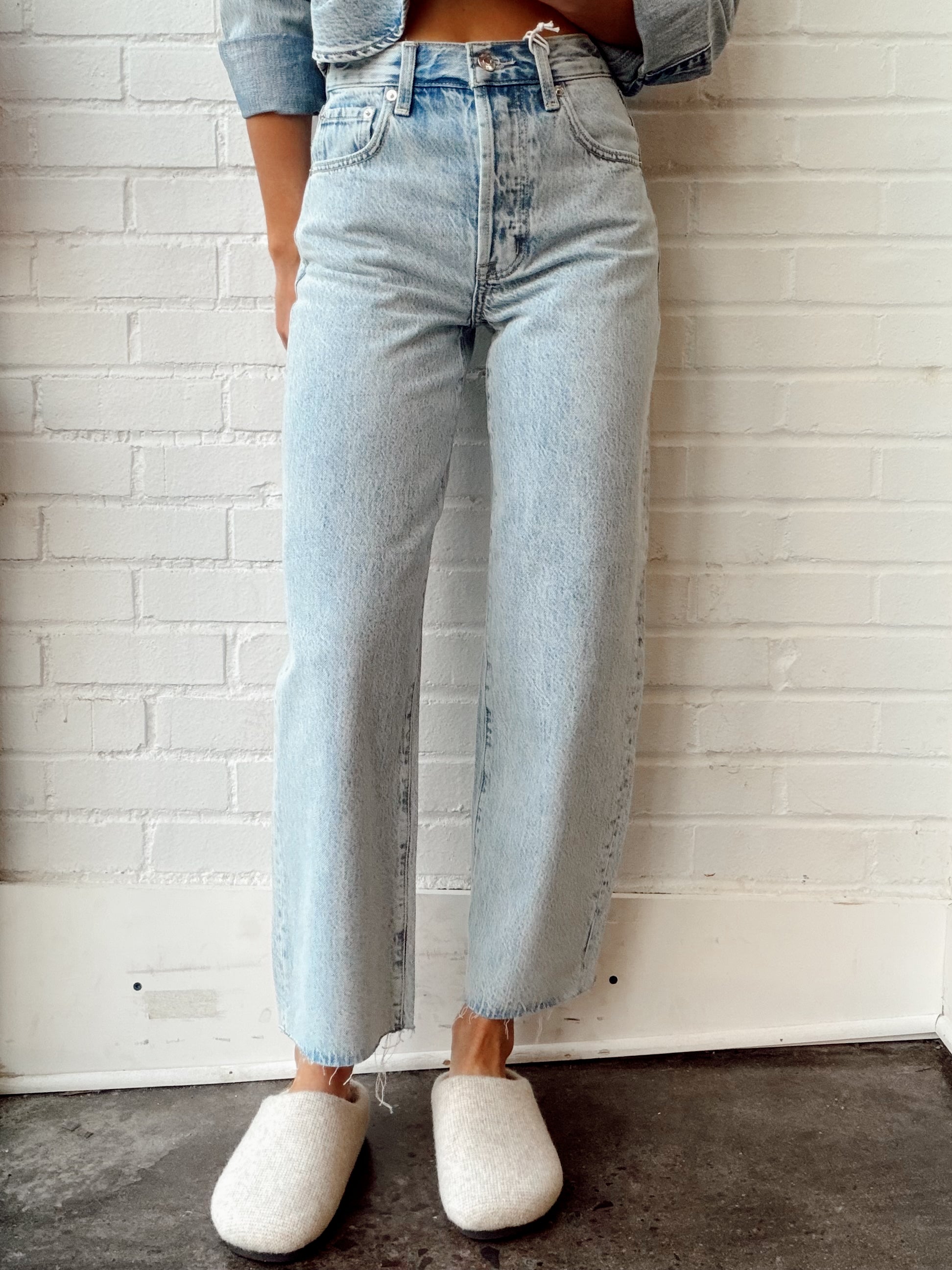 A modern take on a signature shape, Tate Crop sits high at the waist with a bowed wide leg and cropped 28" inseam, striking the balance between structure and ease.